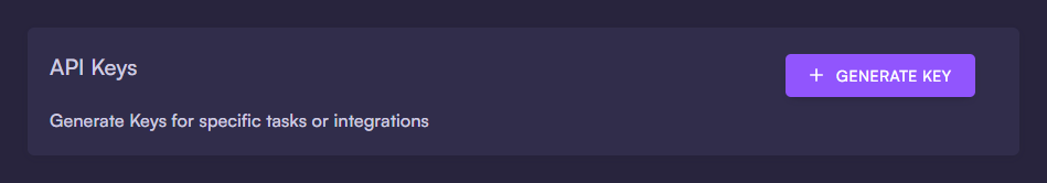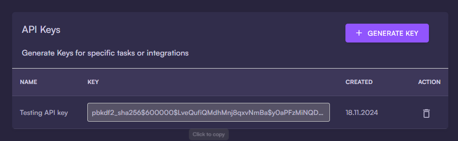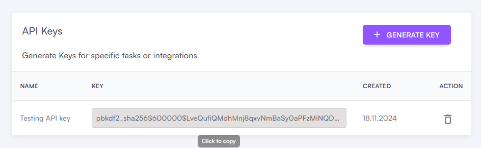 We suggest using a different API key for different purposes. You can remove an API key anytime by clicking the trash icon.When making an API call, add an Authorization header and set the API key as a Bearer token:You can test your API key by making a
