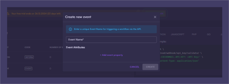 Now you have events set up in your Cocoonmail account, you can start sending events using the API or integrations.Sending events with the API